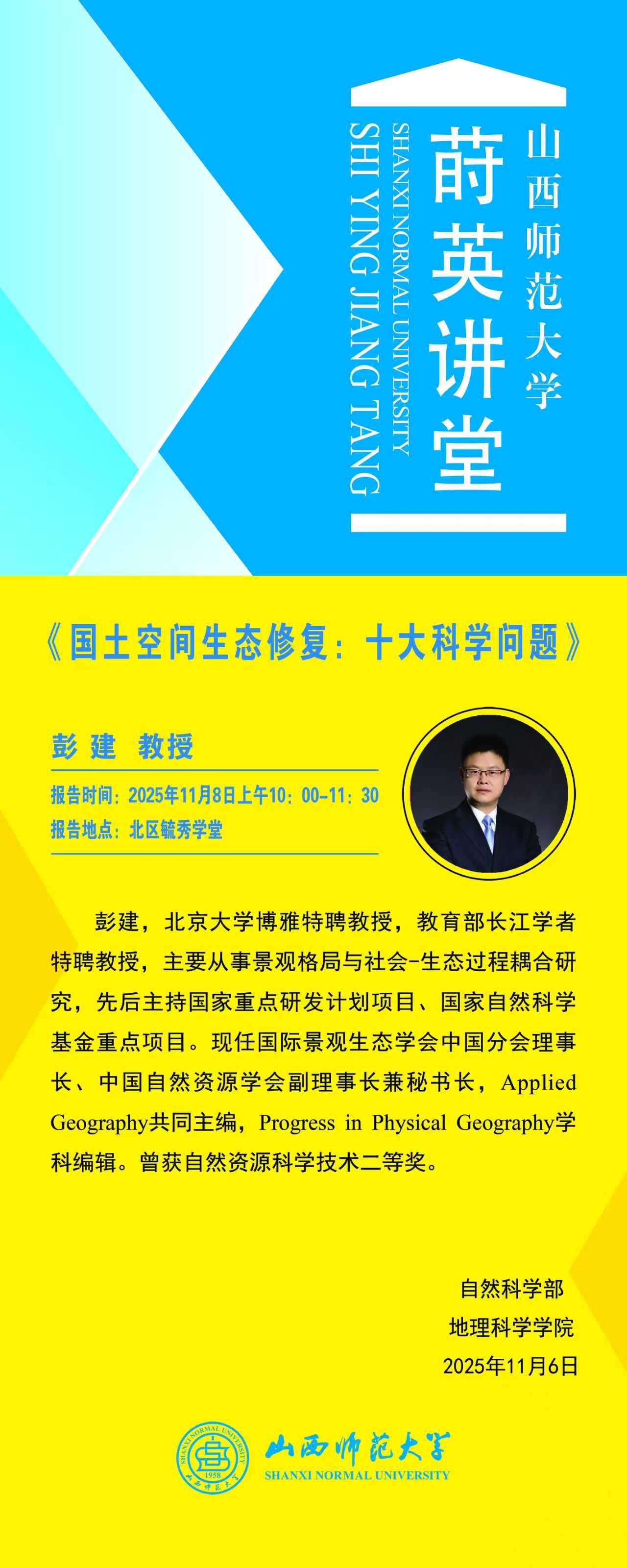 【预告】北京大学彭建教授应我校邀请作学术报告