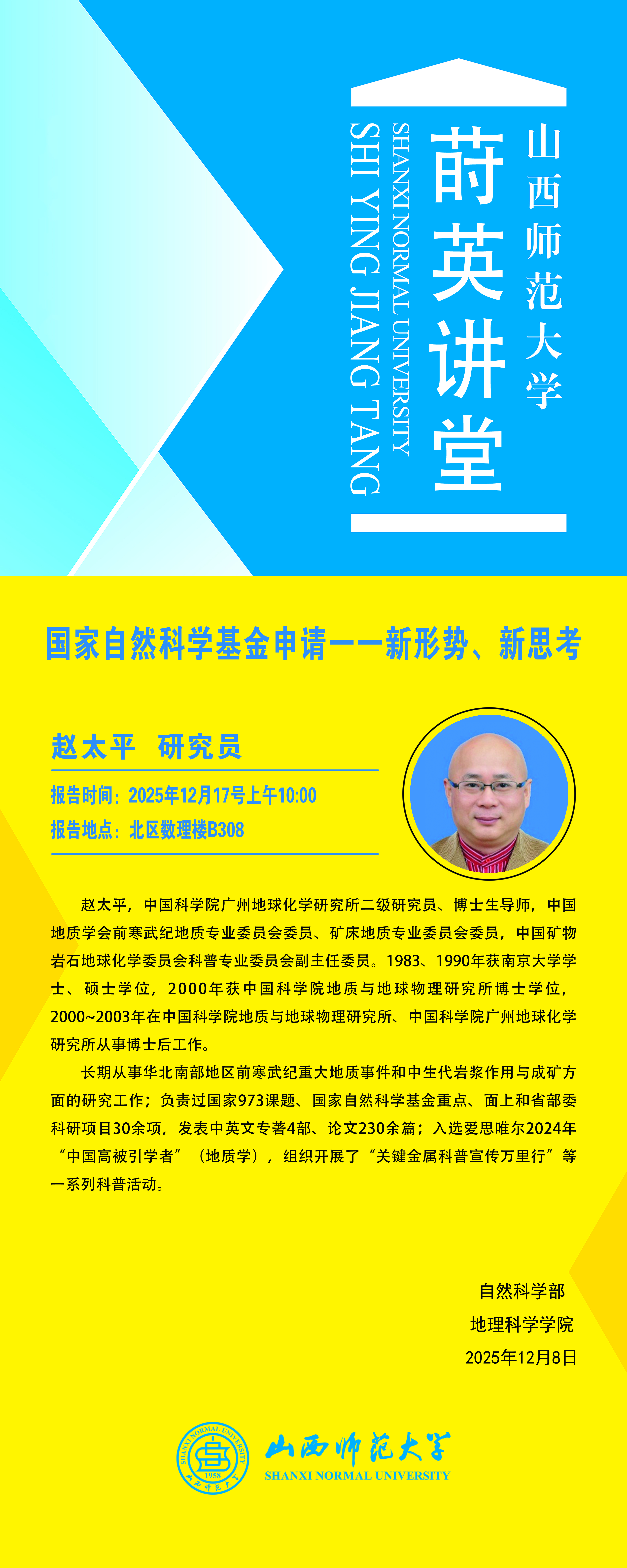 【预告】中国科学院广州地球化学研究所赵太平研究员应我校邀请作学术报告2